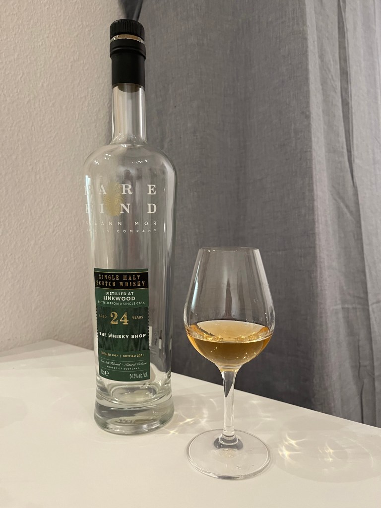 On our way back to Edinburgh from a rather improvised long-weekend getaway into the Highlands in summer 2021, Zoe and I spent the night in Inverness. Before departing the city we strolled into The Whisky Shop to have a browse – and there a 24 yo Linkwood caught my eye; a single cask bottling at 54.3% for TWS. No trace of this bottling was to be found online (I have since added a WhiskyBase entry), but the store clerk could, after calling someone within the company, confirm that the contents were from an ex-bourbon cask, as the colour would suggest. And the bottle in my hand was the very last one for sale! And so I departed from a dear £120…