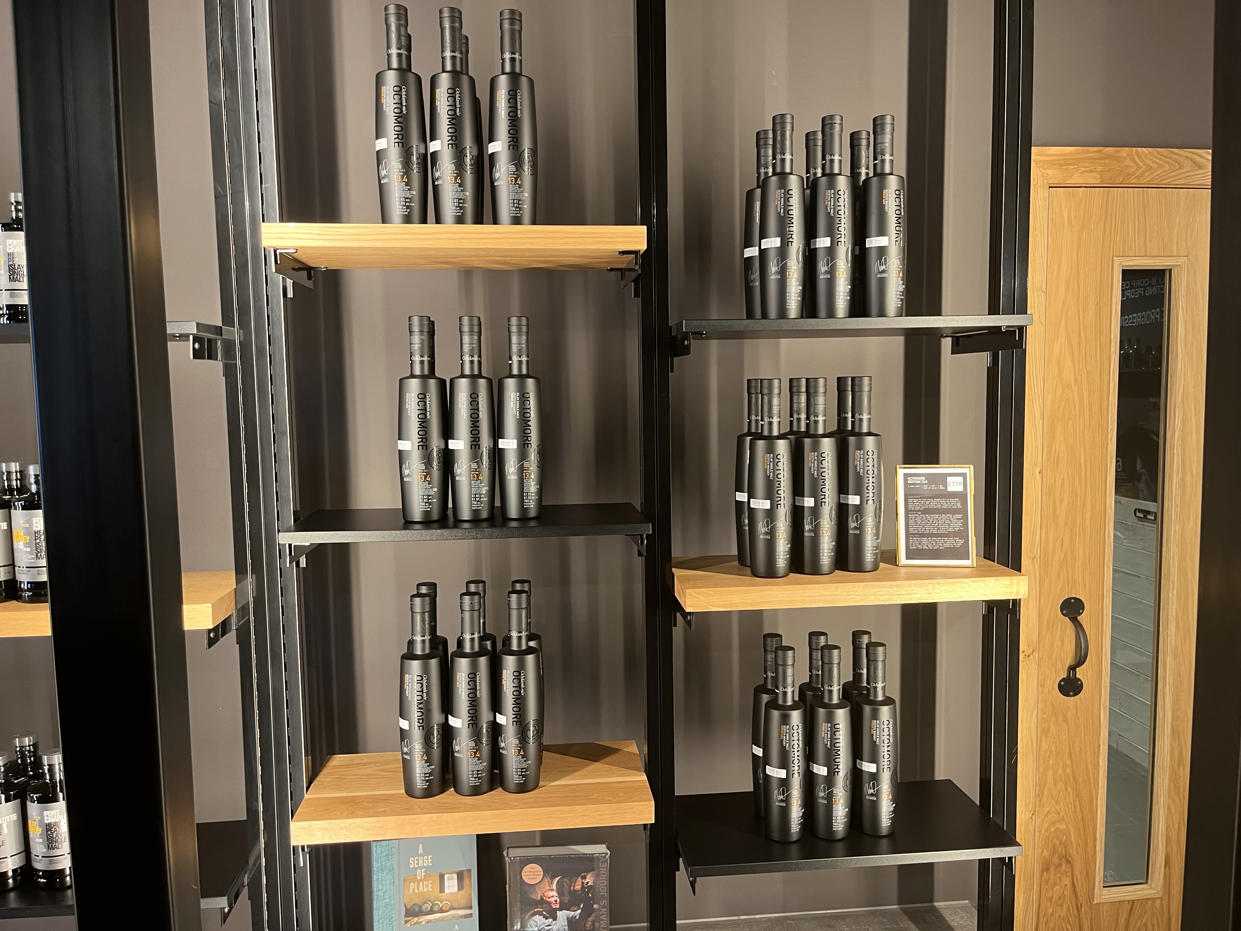 Off the ferry we headed straight to Bruichladdich distillery, with its iconic blue-on-white typography (“camp” according to a Geordie in our group). We hung out in the shop / tasting room and sampled the 2013 local barley releases of Bruichladdich, unpeated, and Port Charlotte, the brand used for peaty Bruichladdich. In my opinion, both very competent drams, although I did not register much excitement for Bruichladdich among my peers, except for Octomore – the überpeaty (and überexpensive) Bruichladdich in sleek, obsidian bottles.