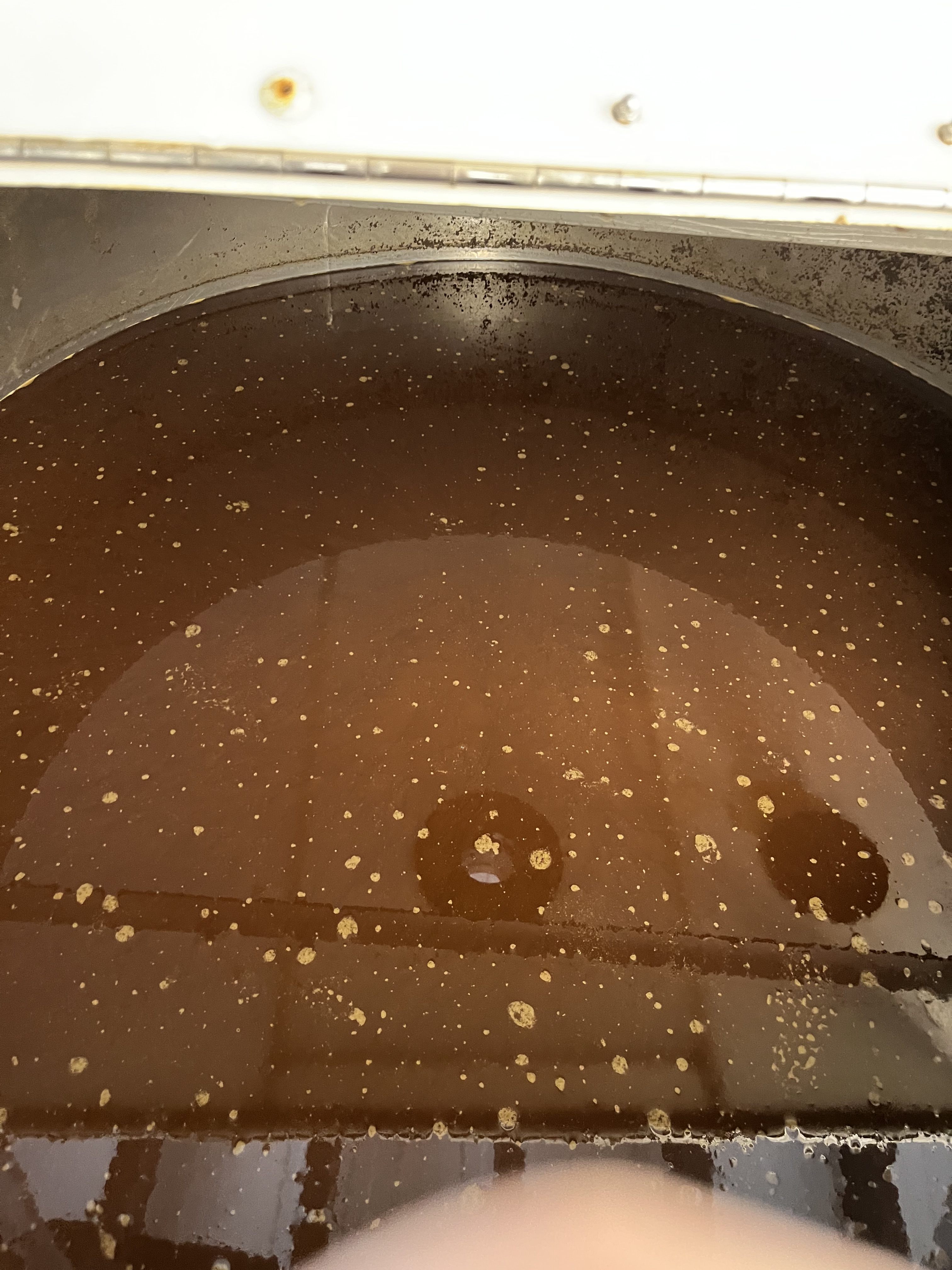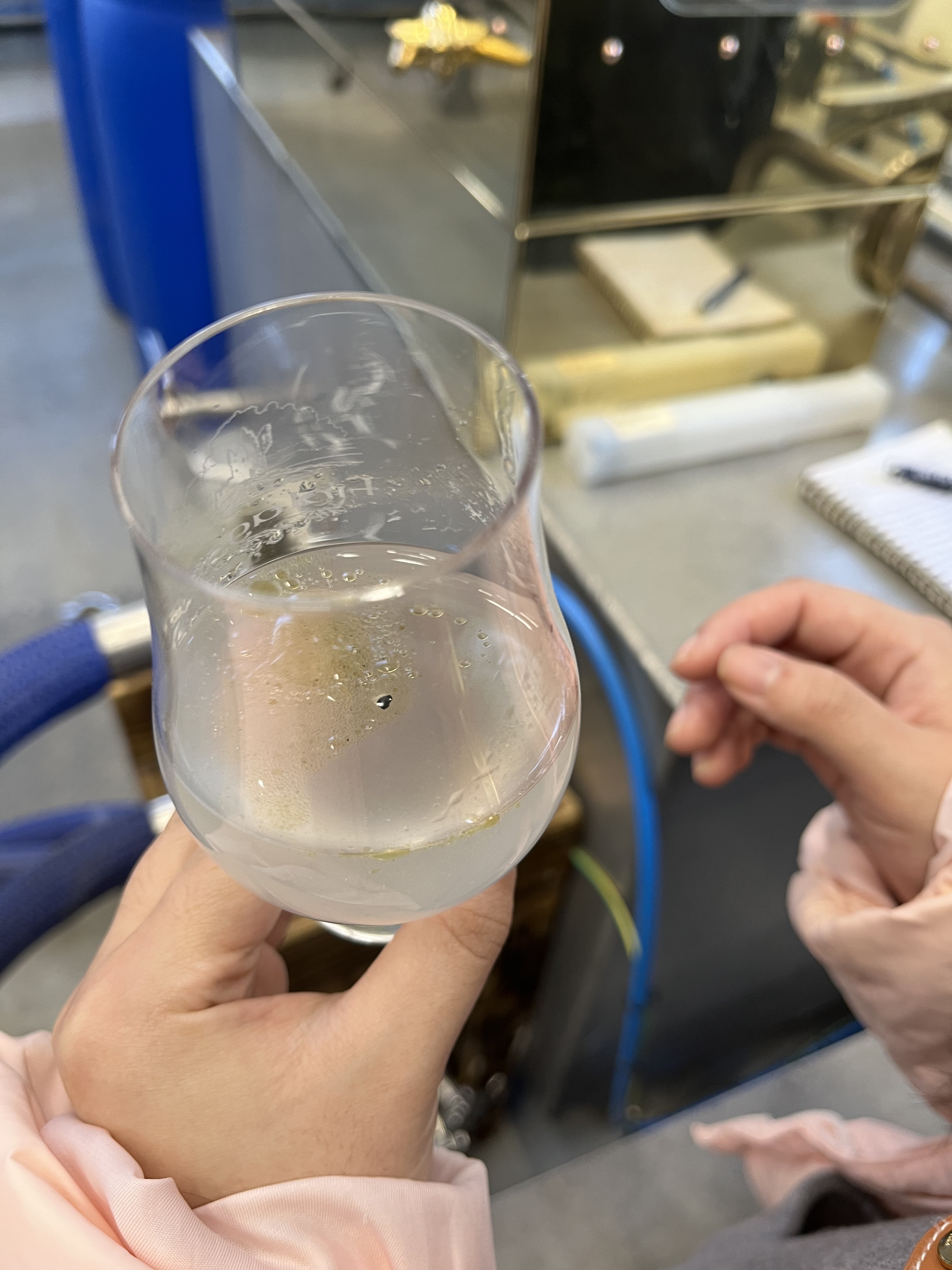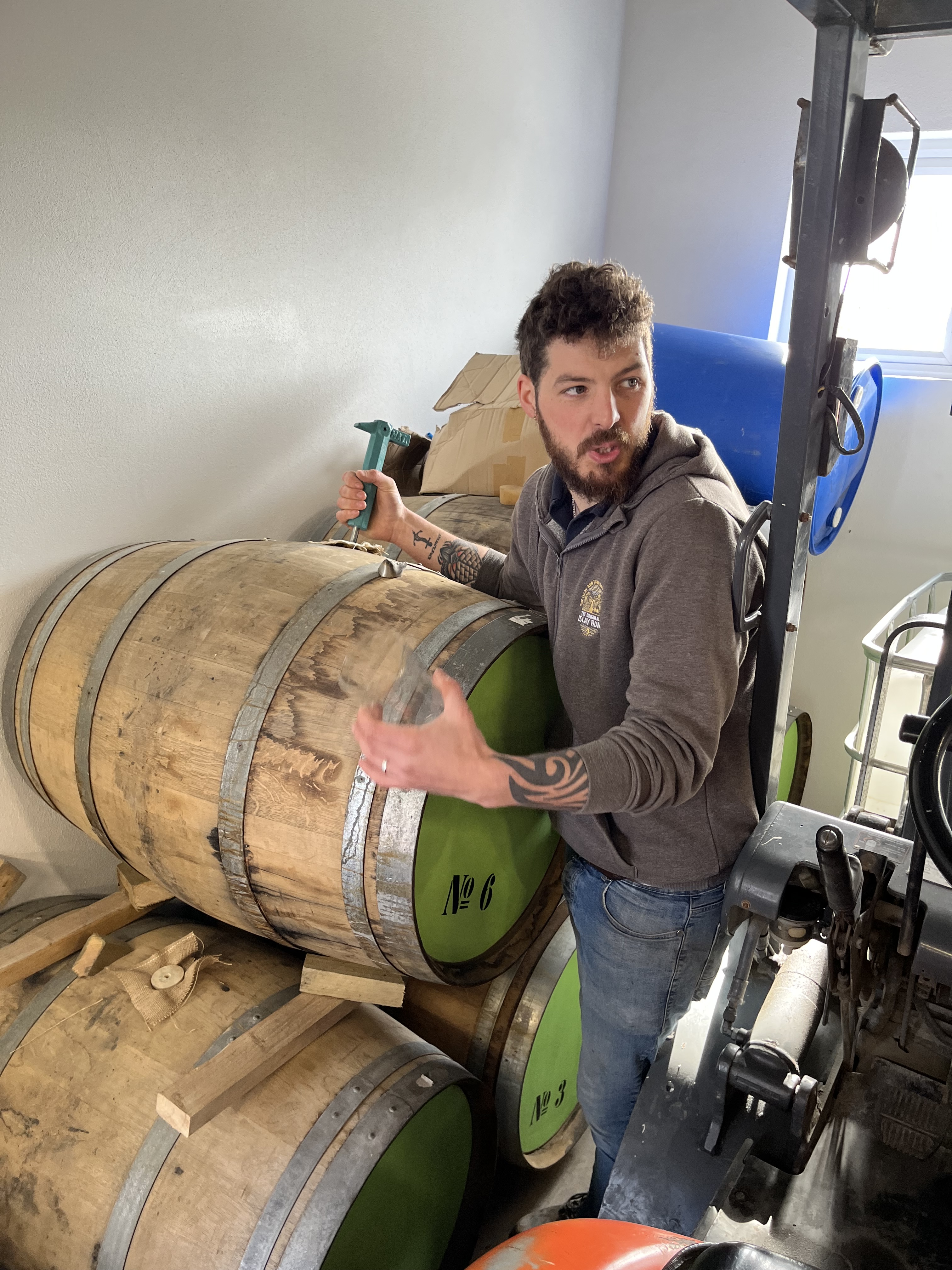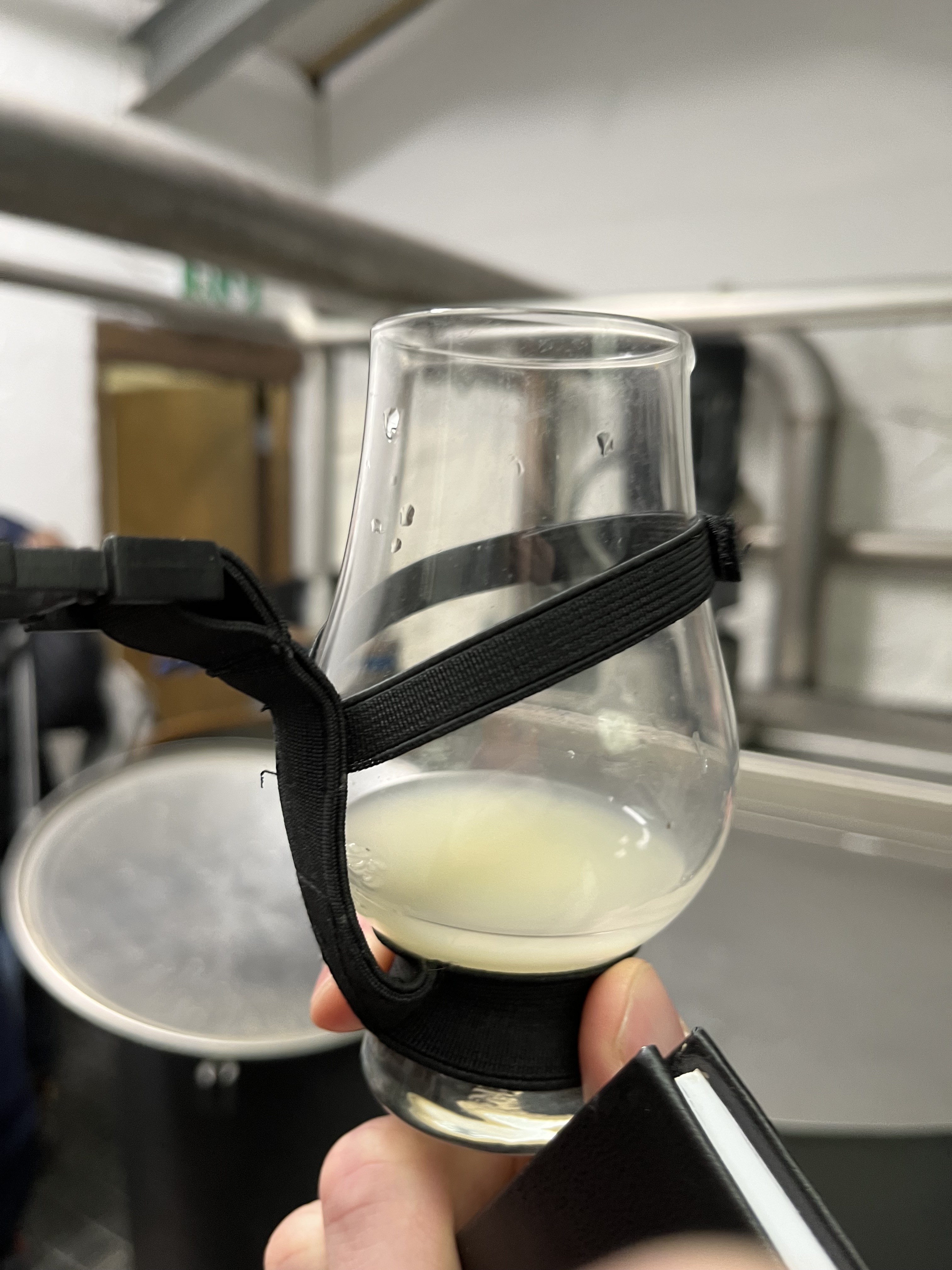The still configuration is a bit different than you’d find in a whisky distillery, and of a design due to some 19th century bloke, Adams. A copper pot still for the wash (same as for whisky) feeds into a first ‘retort’ still which feeds into a second. The first retort contains the low wines at around 25% ABV, the second the high wines around 50% ABV. The vapours of one stage bubble up through the next, depositing heavier compounds and water and vaporizing more alcohol, thereby upping the oomph through each step. The spirit coming out of the second retort gets fed through the spirit safe, where it can be measured and monitored. The spirits comes through at a very high ABV that drops over time: the ‘foreshots’, up to 90% ABV, are fed back into the high wines; the ‘heart’ around 70-80% is the high-quality spirit taken out as new make rum. Of course we tried some: fragrant, earthy, meaty. And in the picture below is foreshots in a glass with oils forming at the top. In contrast to whisky, the foreshots contain no poisonous methanol, though.