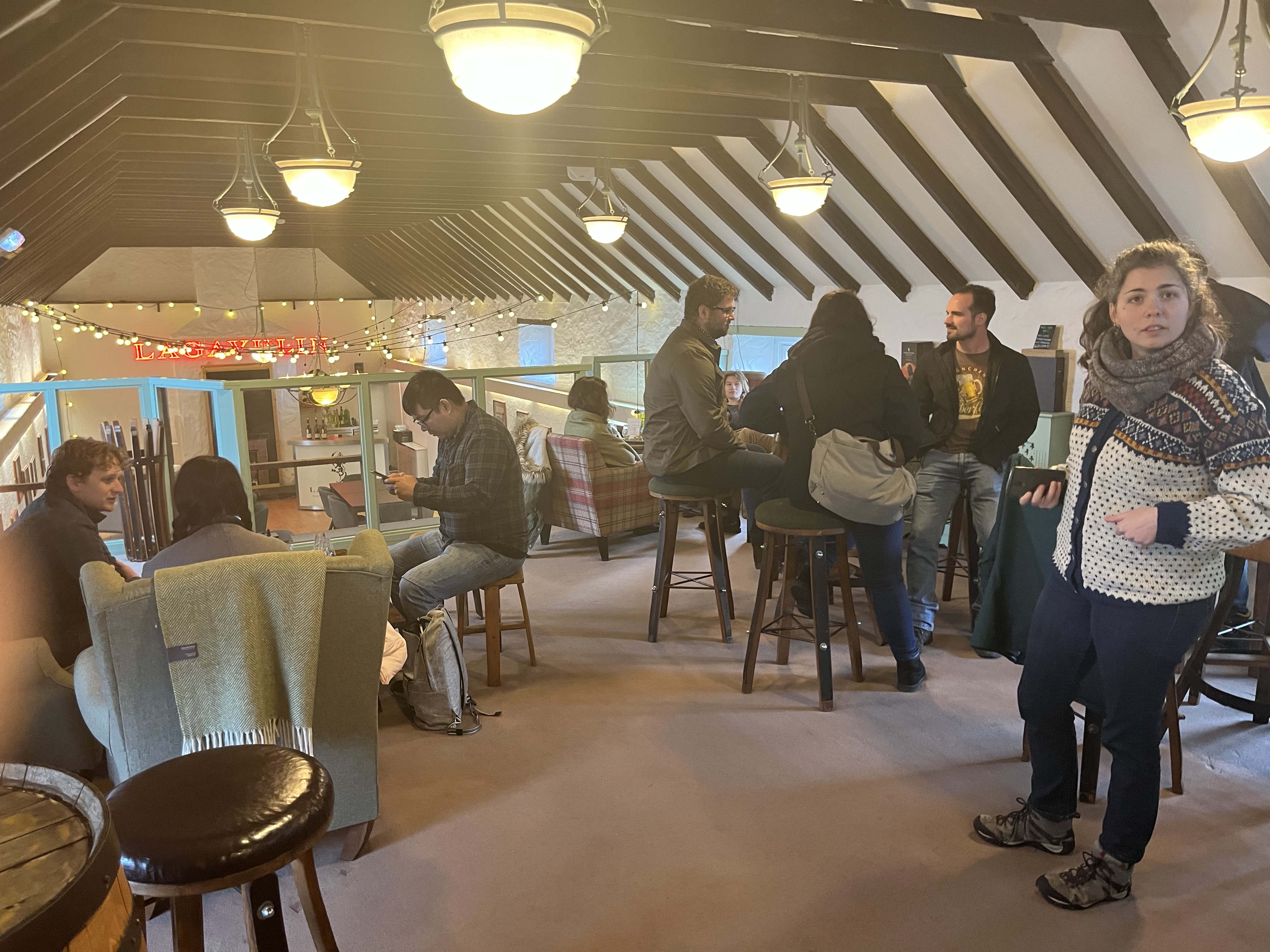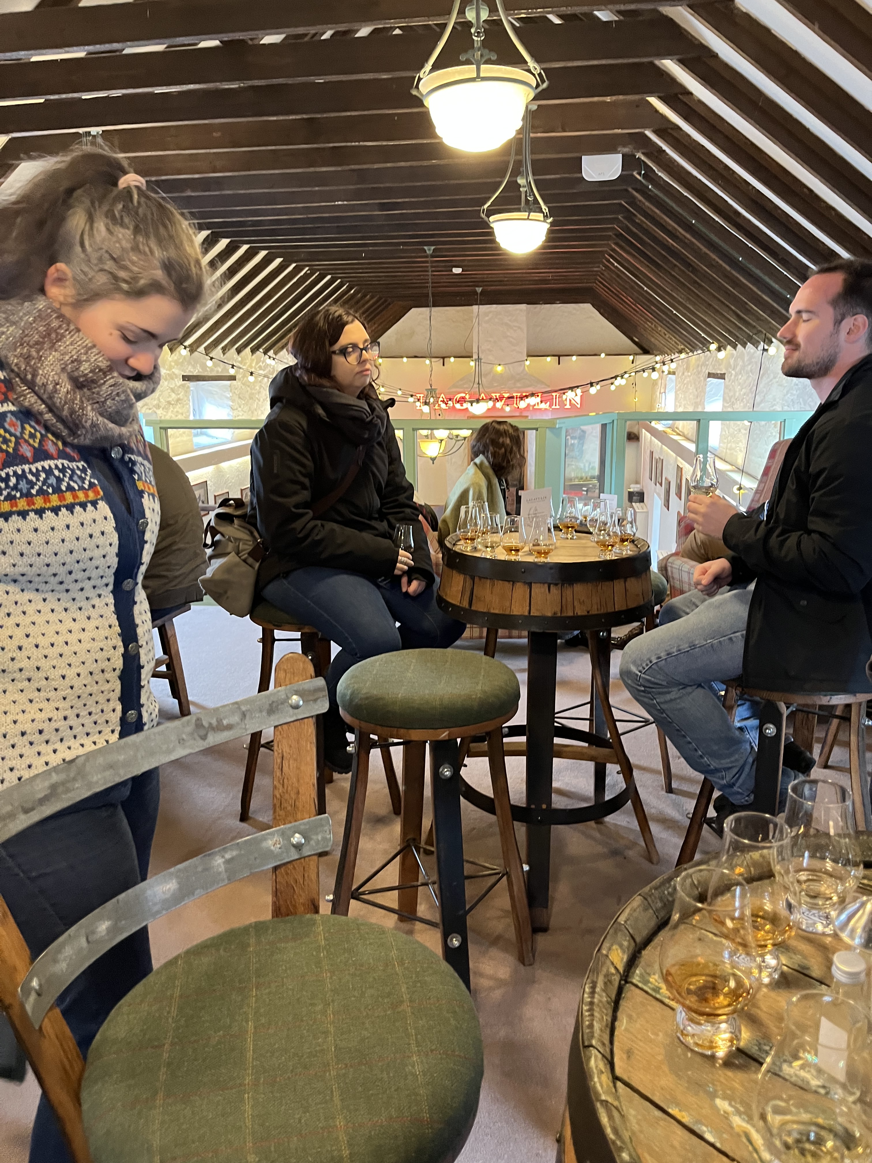 With rum in our bellies we continued on to Lagavulin, for a booked tasting (but no tour). The tasting room had a nice whisky-y atmosphere, and after a quick presentation of the three drams – the Lagavulin 8yo, 16yo, and 16yo distillers edition – we were left to our own paces.