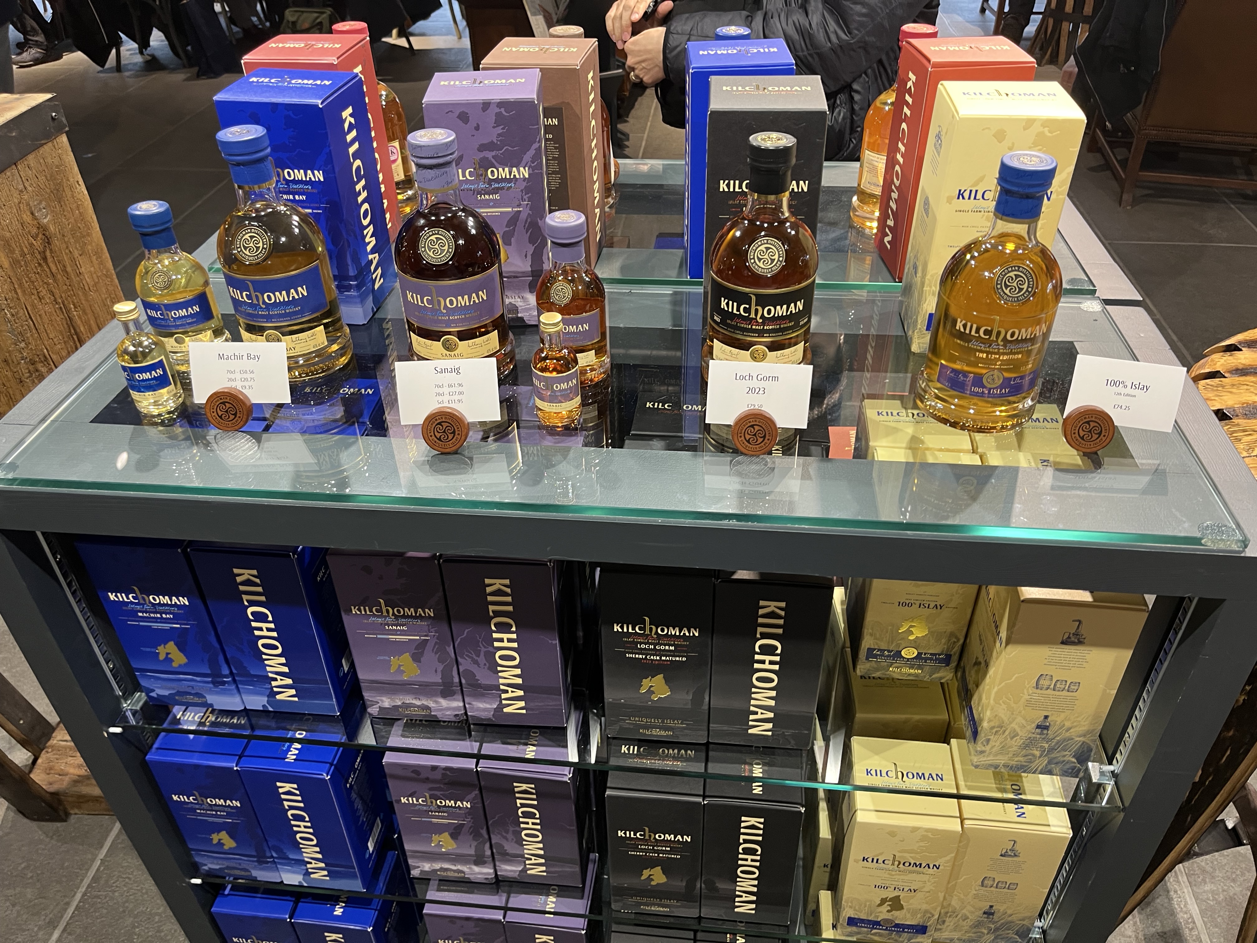 Kilchoman themselves have been expanding in recent years, both with a new still house and a spacious new visitor centre. Entering the latter, we found a whisky bar, a tasting room, and a liiiiitle stand of Kilchoman whiskies among the other product shelves. I sent some pictures to Mikael, father my dear friend Filip in Sweden, who is probably our country’s biggest Kilchoman fan and collector.