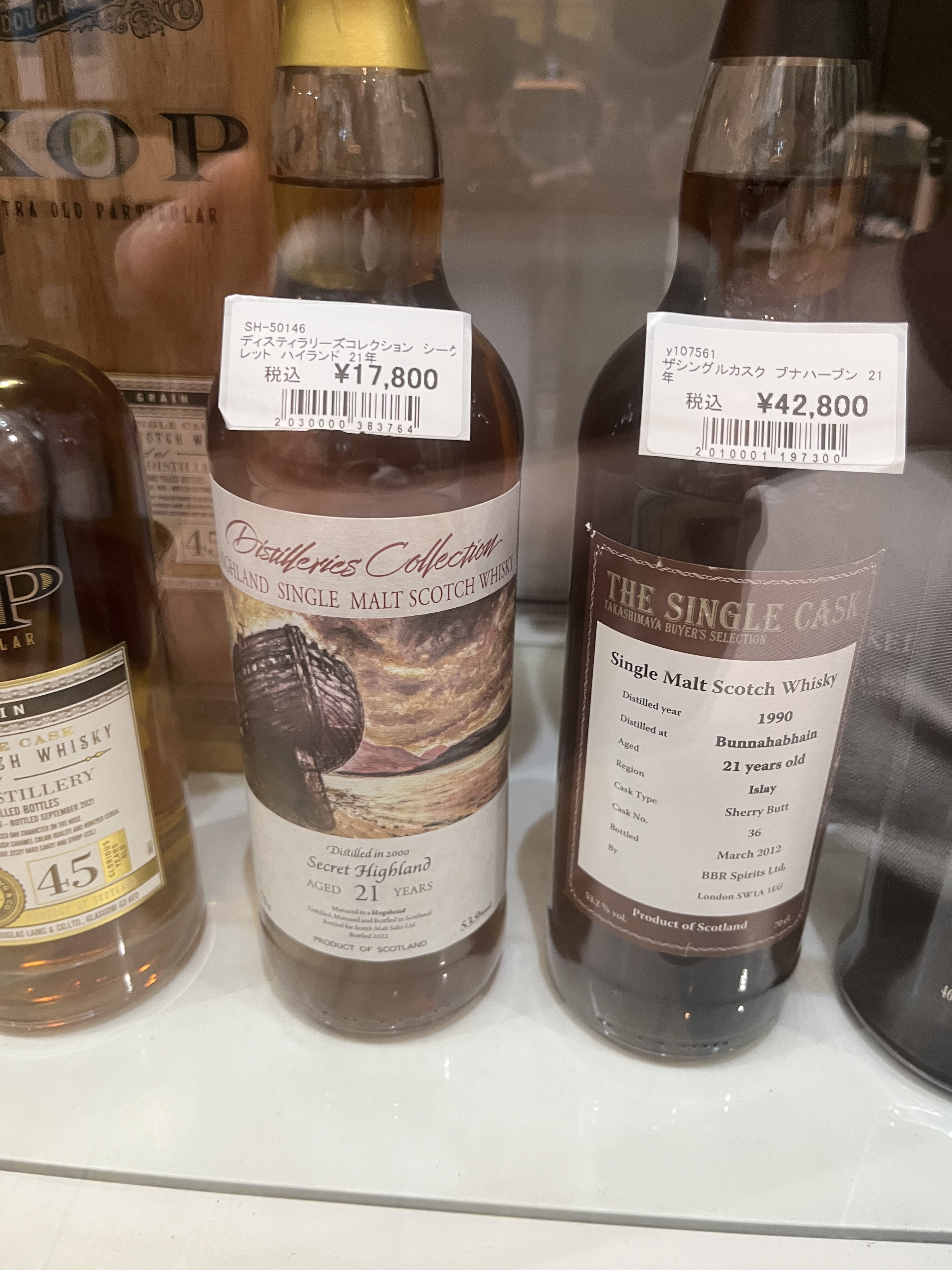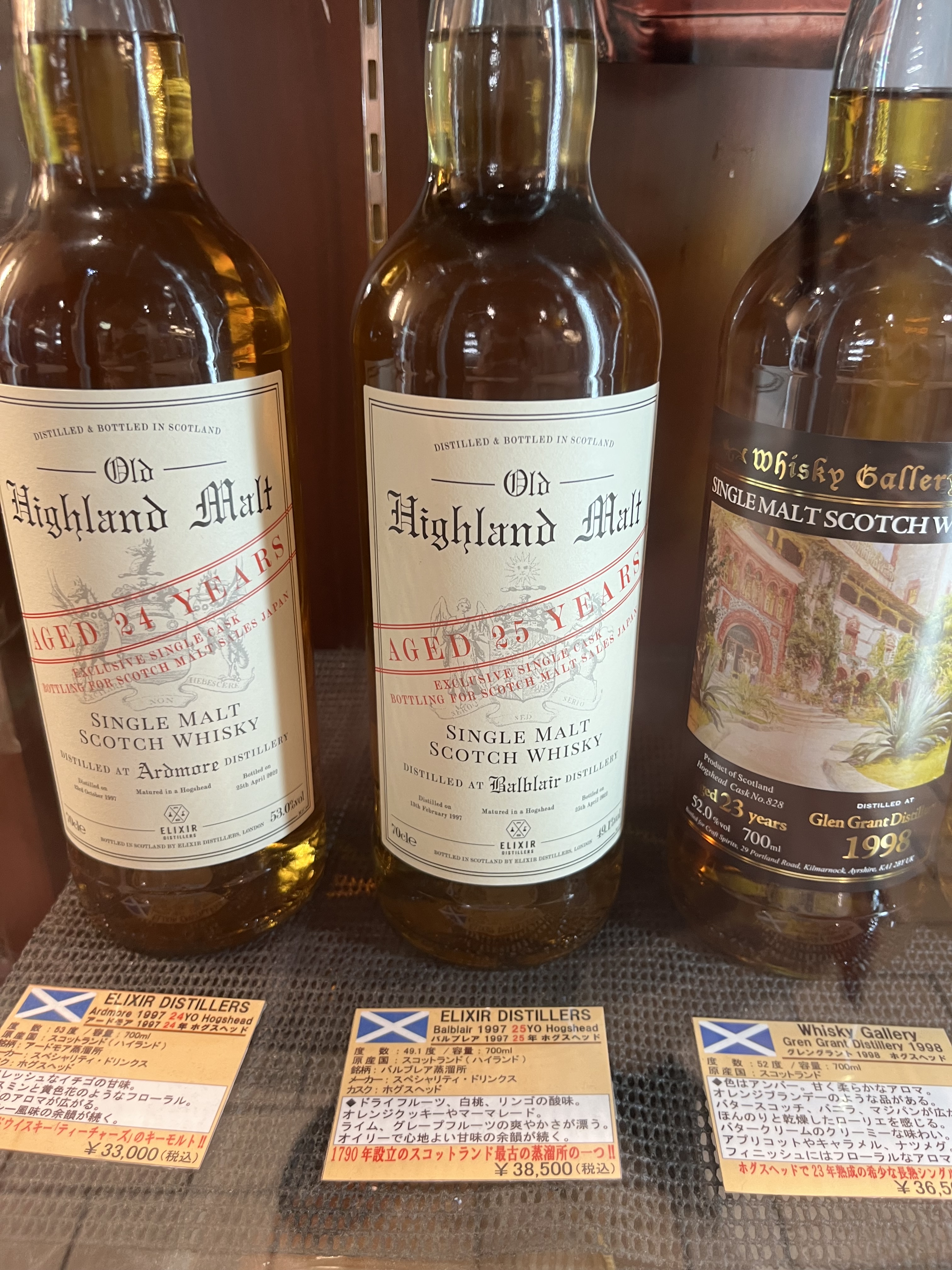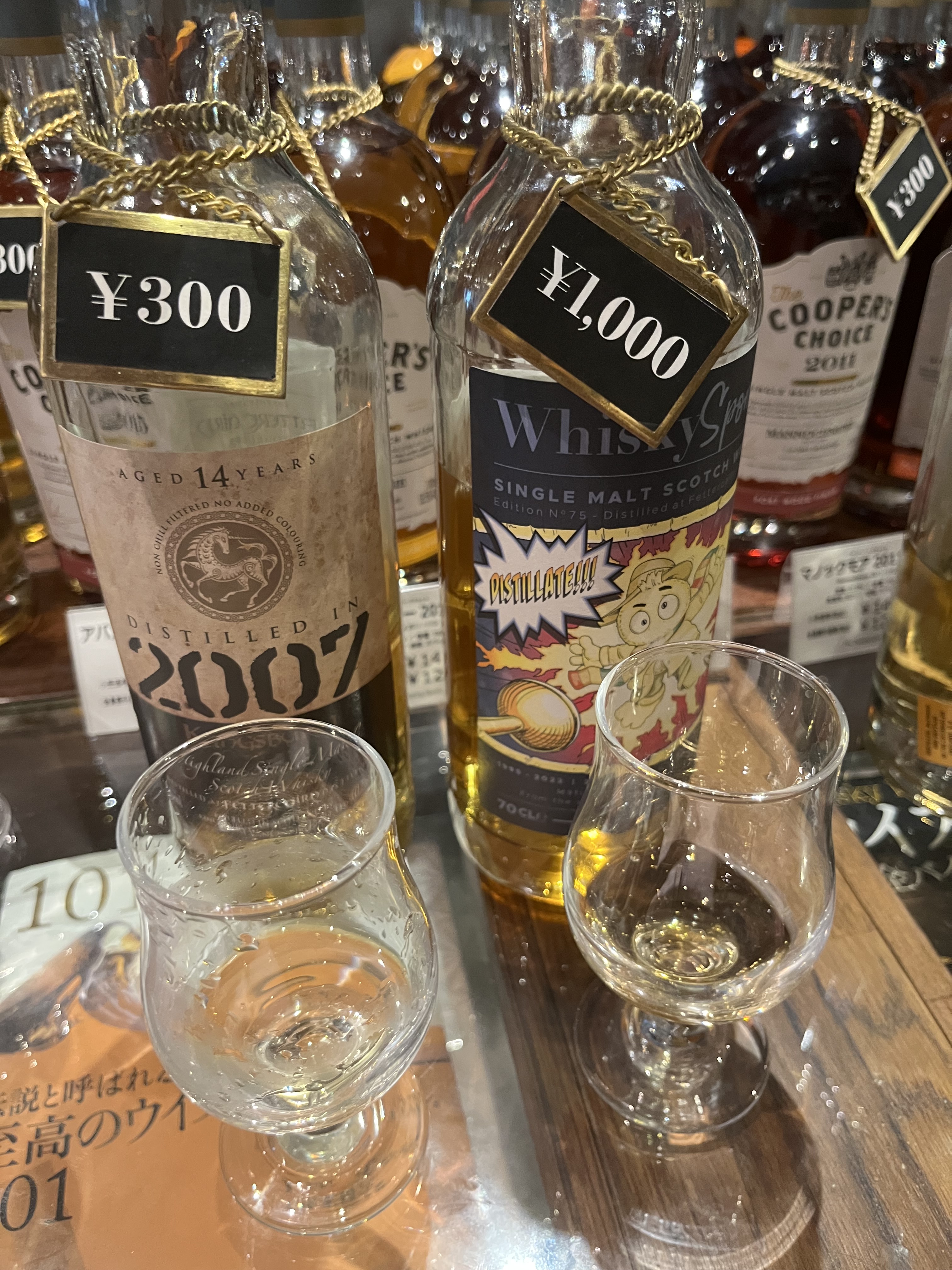 Fun place! Lots of open bottles of IB stuff with price tags on; one could bring bottles to the counter, and they would pour and take the cash right away. Prices were per cl, and 1000 yen is about 6.4 euros. I contemplated a while whether to get a whole bottle of the 21yo Secret Highland (most likely Clynelish) which they had in stock. Quite rubbery and sulphury, but I was actually enjoying it as a strange and savoury dram. In the end the price was too much, and I skipped.
