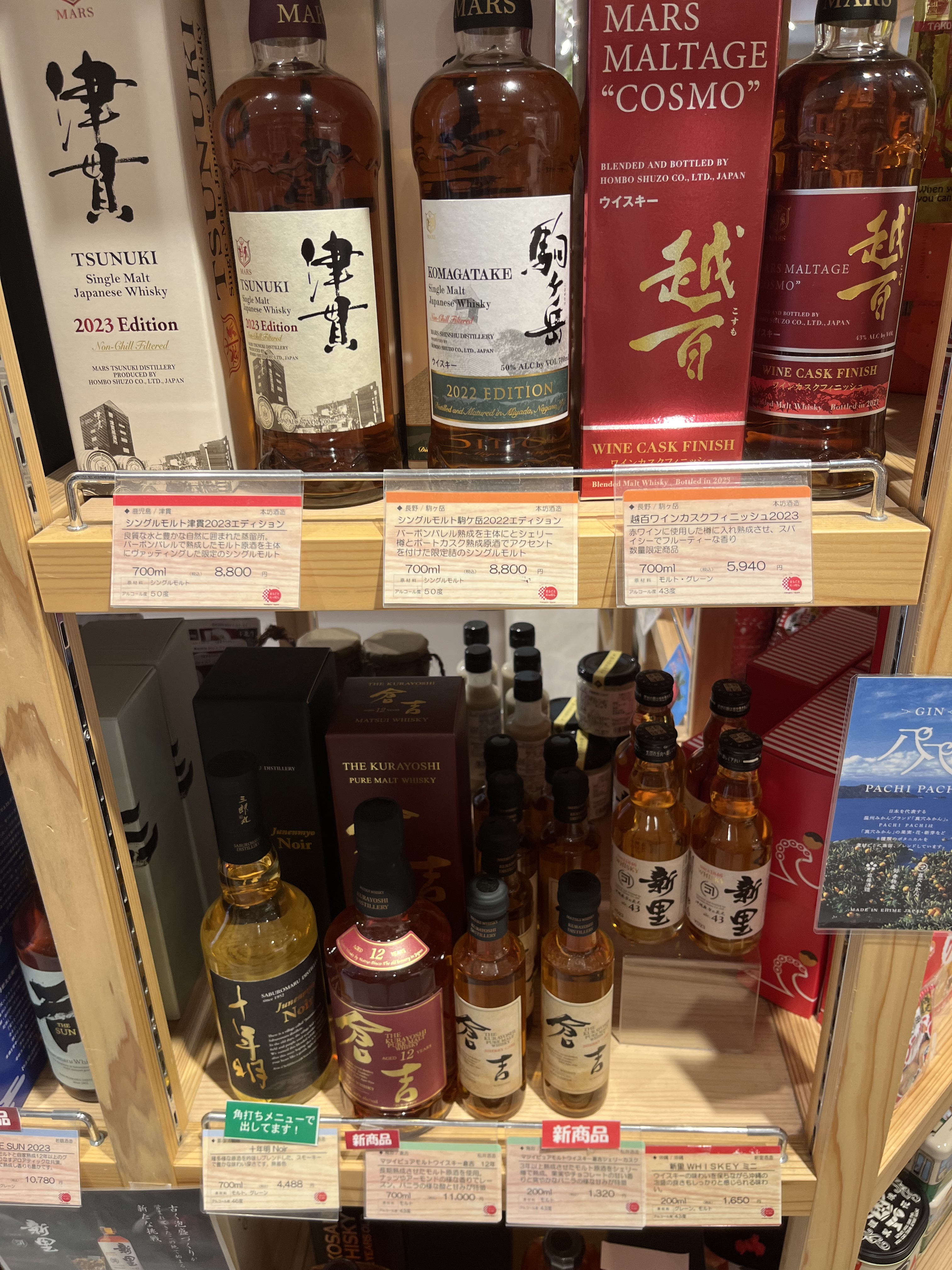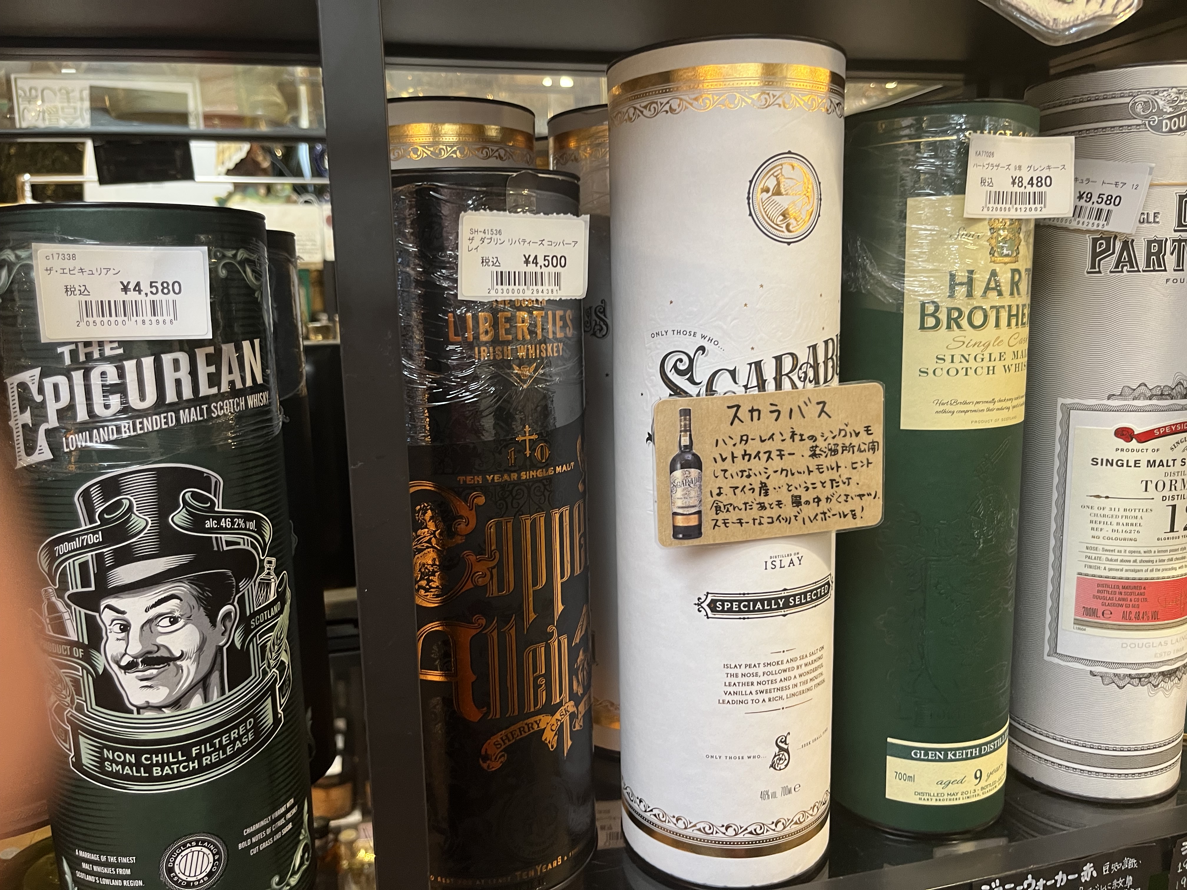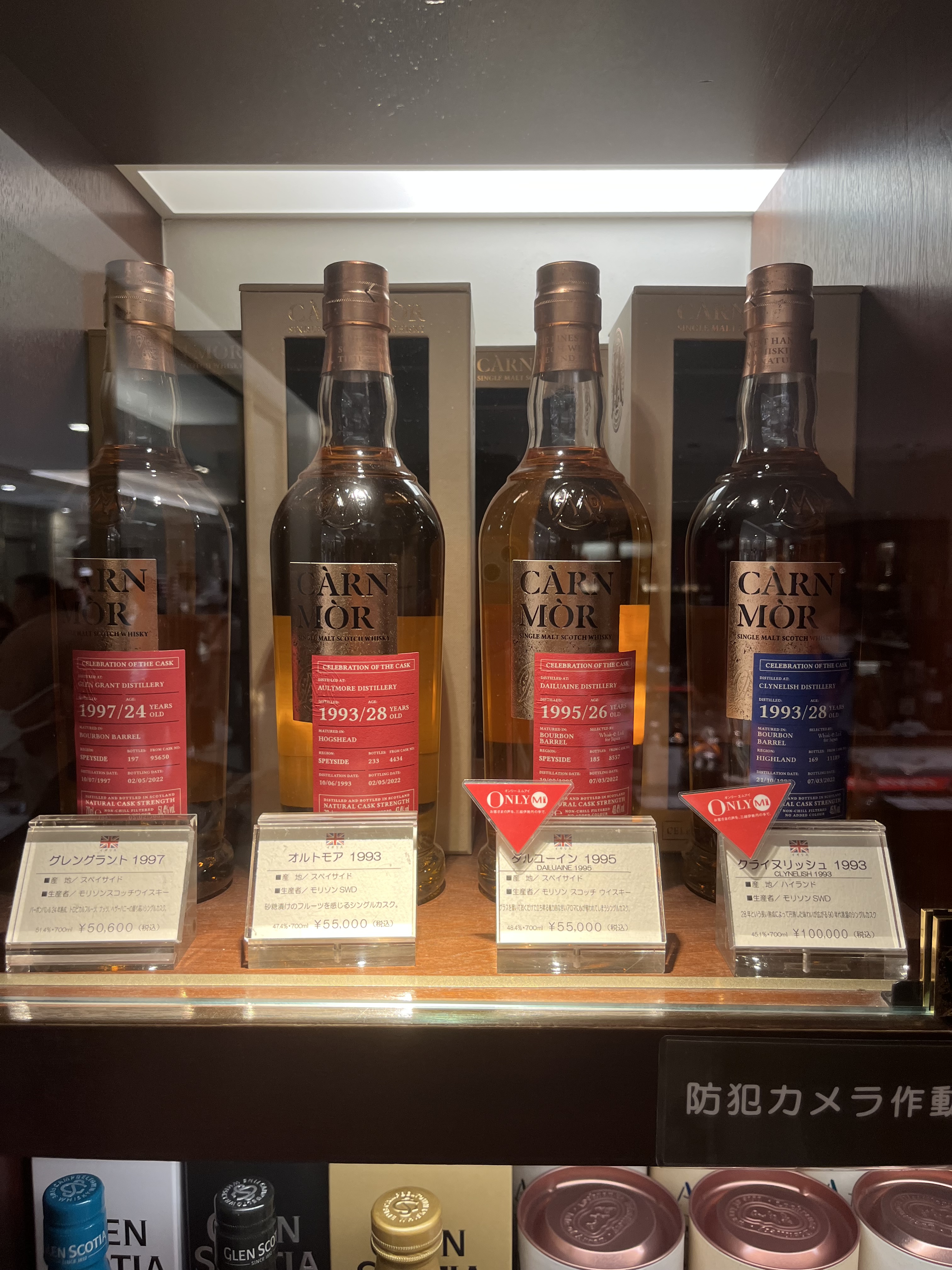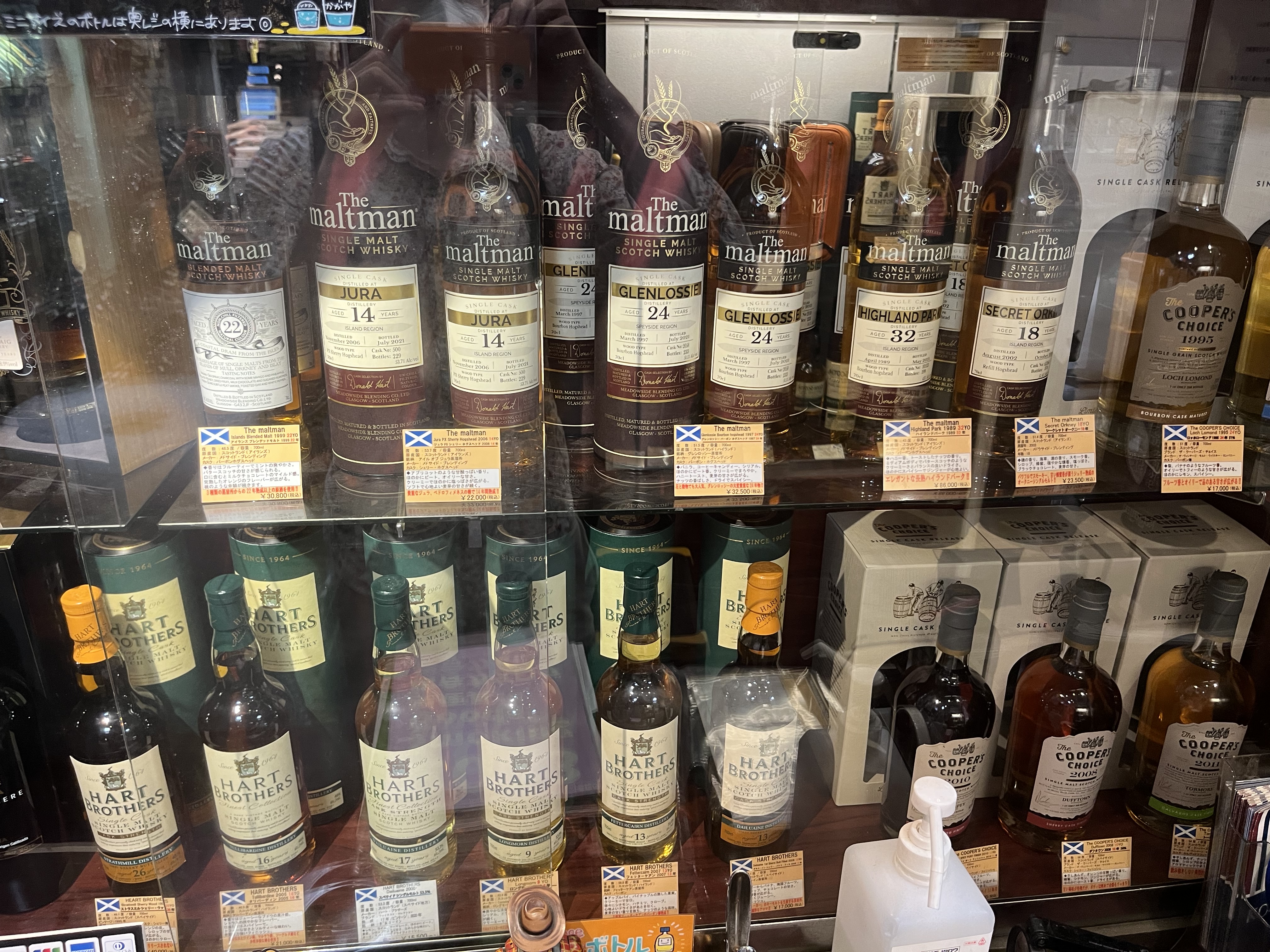 Fun place! Lots of open bottles of IB stuff with price tags on; one could bring bottles to the counter, and they would pour and take the cash right away. Prices were per cl, and 1000 yen is about 6.4 euros. I contemplated a while whether to get a whole bottle of the 21yo Secret Highland (most likely Clynelish) which they had in stock. Quite rubbery and sulphury, but I was actually enjoying it as a strange and savoury dram. In the end the price was too much, and I skipped.