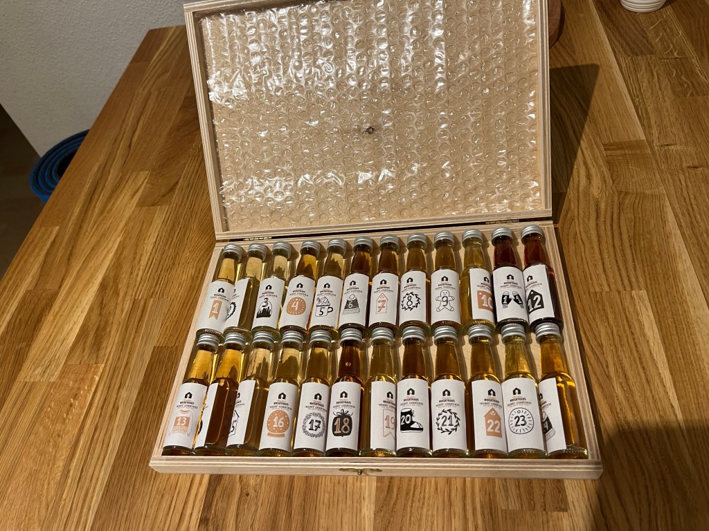 In May 2023 I pre-ordered the whisky calendar from Brühler Whiskyhaus for a whopping €224.90. That works out to €9.37 per 2cl sample, on average. So one can expect some quite exclusive drams in there!