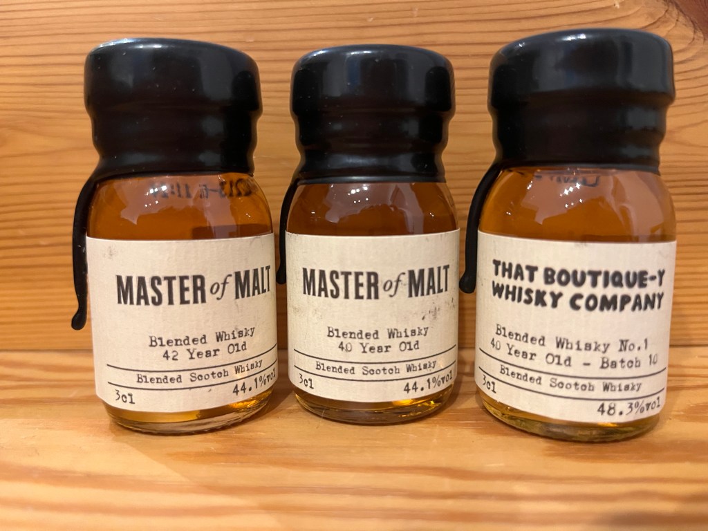It’s been a lot of single malt recently. Not only recently, but in general. Time to take things a little less seriously with some unassuming blends. Let’s see what we have in the cupboard. Ah, according to my secret files, I acquired some blend samples on October 31st, 2022, though a UK order at master of malt. Let’s have those.