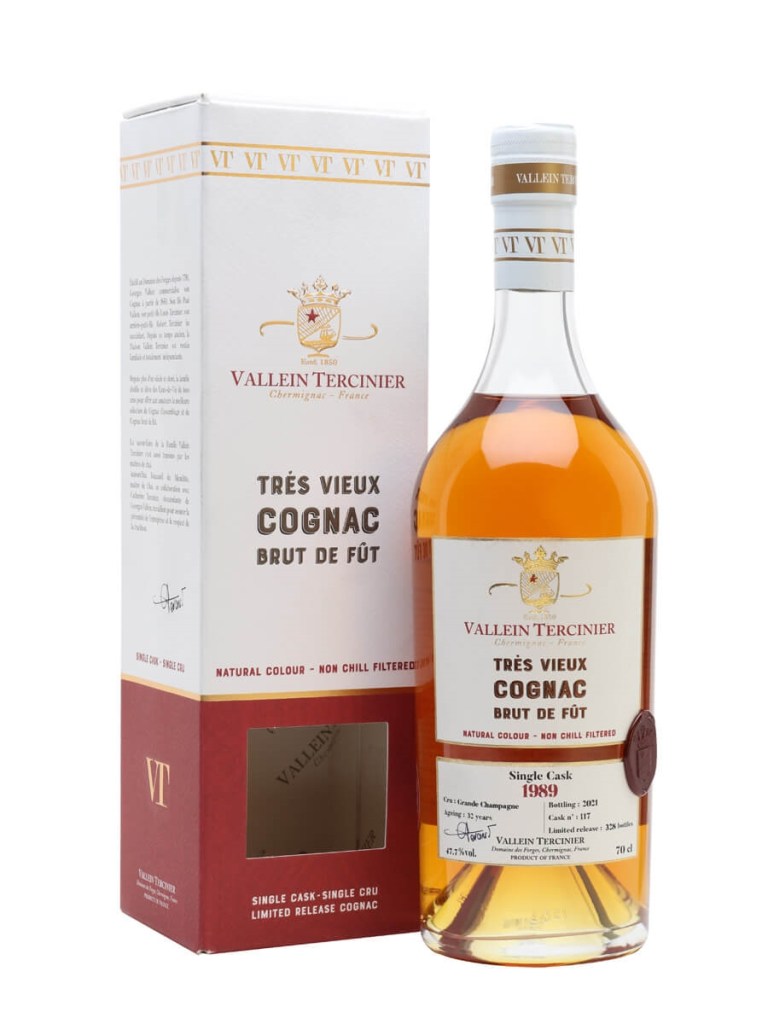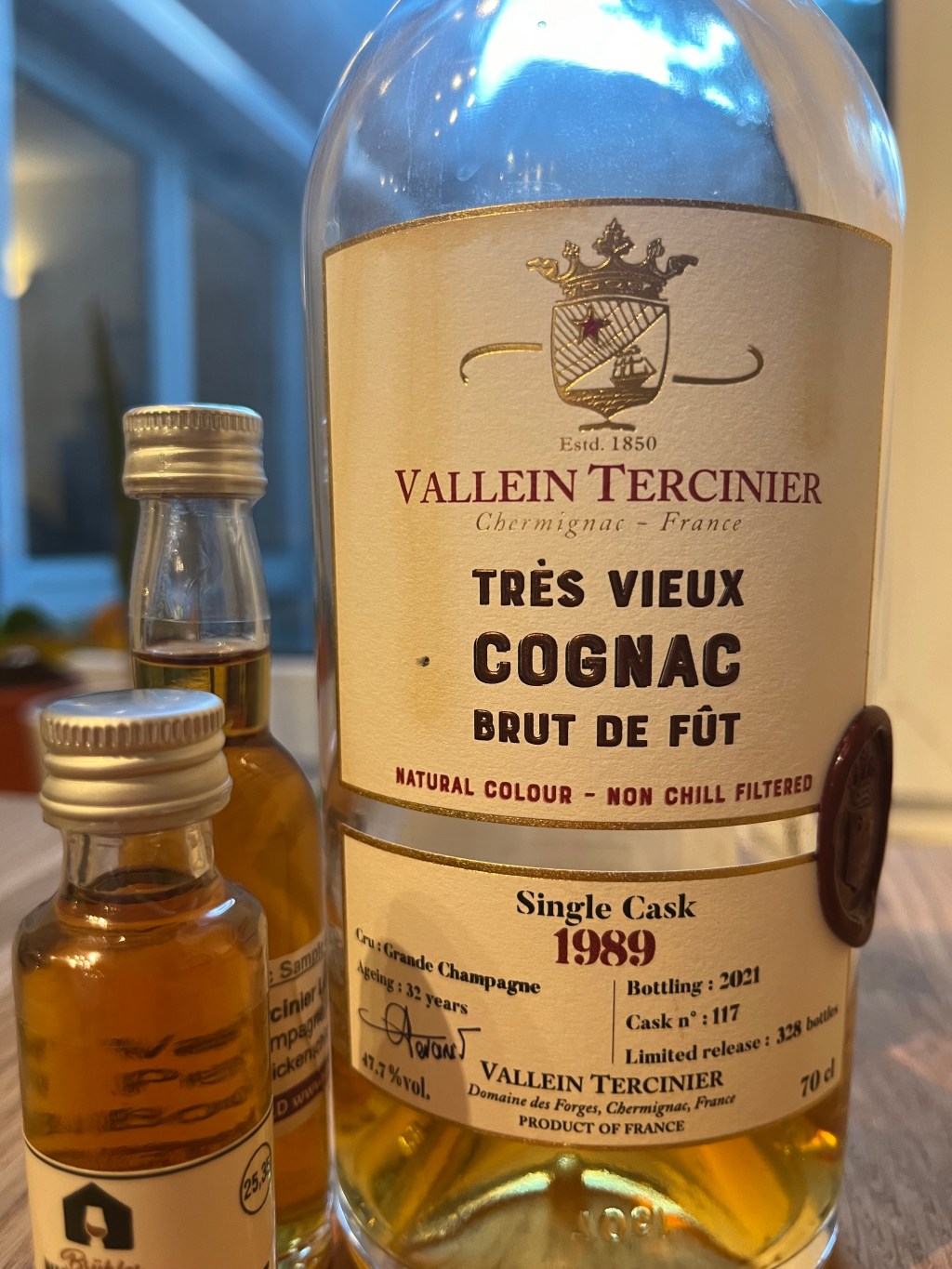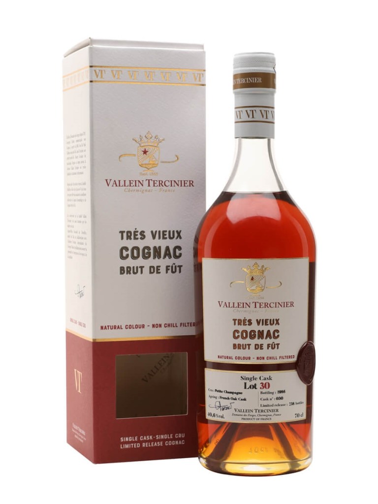 Another first for this blog β a cognac review! β but I’ve been enjoying good cognac for a couple of years now. Naturally, I simply skipped over the mass-market Remy Martin, Hennessy, Camus and their ilk β if bland whisky isn’t worth the time, cost and liver damage, sure as hell bland cognac isn’t either. A Parisian shop owner suggested I should advance through cheap and simpler cognacs to more complex and costly ones over time to know how to appreciate it, but I coldly count on a palate trained to appreciate complex whisky will not underappreciate a quality cognac. Maybe I’m like the guitarist who’s starting to play bass, and underestimating the differences in skill needed to master these instruments? Well, I am literally a guitarist who’s thinking about buying a bass, and since I have such an amazing electric guitar whose premium features (ergonomics, multi-scale and extended range) I enjoy tremendously, why should I not get a bass with similar features if I can afford it? Well, in any case, my entry point into cognac was looking at what the specialist whisky retailers were stocking as ‘malternatives’. There I discovered Vallein Tercinier, bottled from a single cask (“brut de fΓ»t”), non-chillfiltered, no additives, with vintage and high age statements, and seemingly fair prices. On paper at least, it can’t get much better. So I took a chance, and am very glad I did. Along with a few other producers (like Grosperrin, Jean-Luc Pasquiet) VT indeed seems to be the darling cognac of the whisky world.