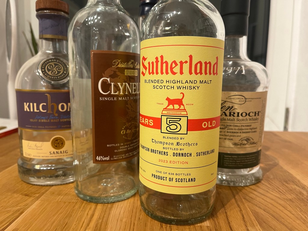 This is the bottle I’ve enjoyed the most in the past year, though I think I opened it around October 2023. It’s a blend of mostly Clynelish (100L 9yo + 214L 8yo, both from refill bourbon) and bit of Dornoch distillery (64L 5yo, Bodega sherry butt – refill Glen Moray barrel), and teaspooned with Brora (1982/2015 Gordon & MacPhail). It just really satisfies me in my current phase of craving an dirty tropical fruit style without much peat influence.